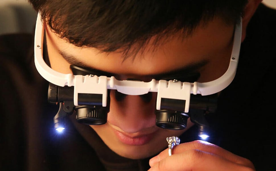 The loupes are mounted on the black eyeglass frames and can be adjusted for comfort while keeping your hands free.